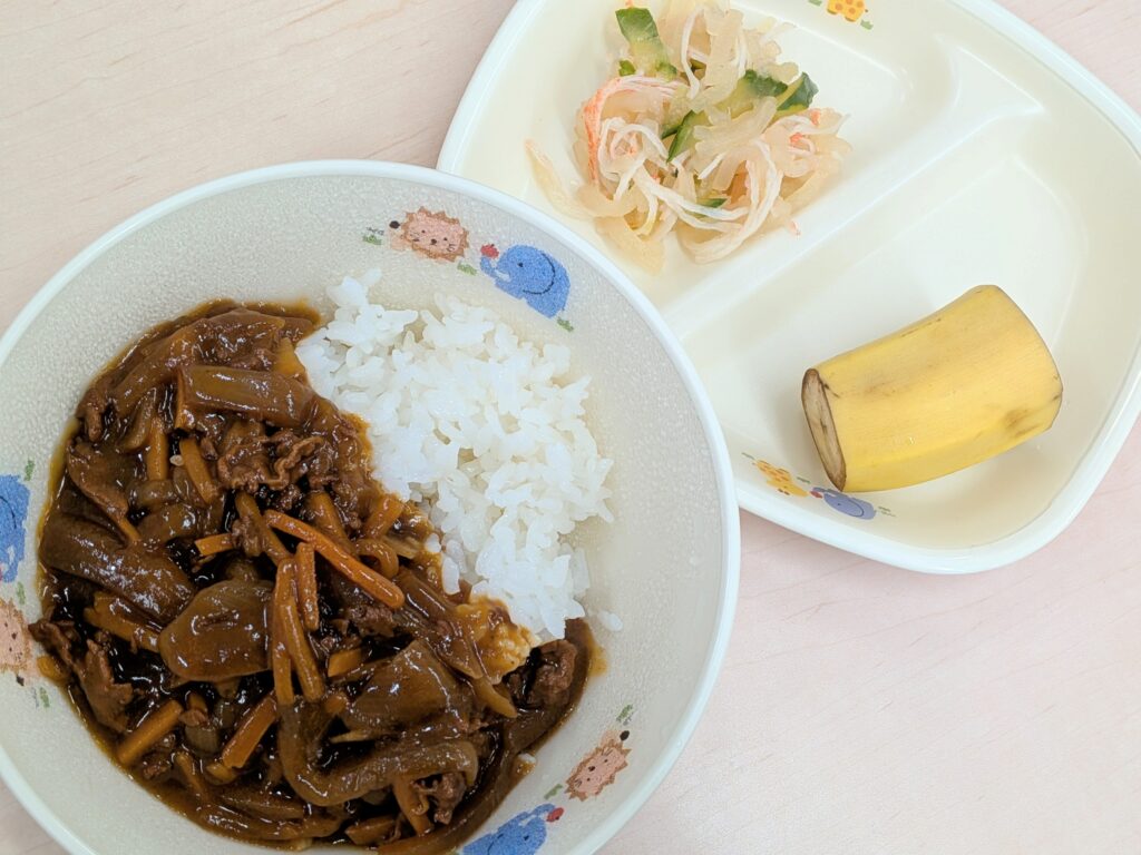 今日(4/18)の給食です - ハヤシライス 大根とかにしぐれのサラダ バナナ