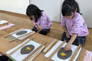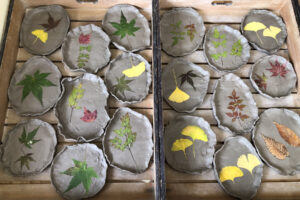 粘土がしっかり広がったら、イチョウや紅葉、ナンテンなどたくさんの葉っぱの中から『どれにしようかな~。』と模様になる葉っぱを選びました。粘土の上に向きを考えながら葉っぱを乗せて跡がしっかりつくように棒で再度伸ばしました。