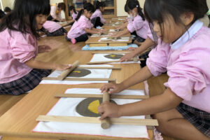 平らに伸ばしていくときに、薄くなりすぎると焼くときに割れやすくなってしまうので、『これぐらいでいいかな~。』『大きくなってきた!』とつぶやきながら、慎重に取り組みました。