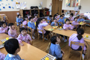 節分に向けて鬼のおはなしを見ている子どもたち。