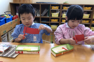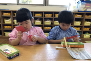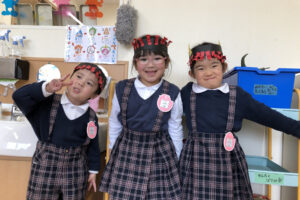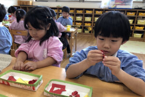 出来上がったものを見て「強そう!」「これで鬼に負けないよ」と嬉しそうな子どもたち。