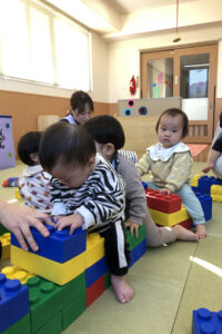 大型レゴブロックでは子どもたちと一緒にブロックを組み立ててバスやバイクなどの乗り物を作ったりお家を作ったりして楽しみました。乗り物を作るとみんなで乗り物にまたがり体を揺らして運転手さん気分♪前に乗っているお友達の横から「ばぁ~」とひょっこり出てくる姿がとっても可愛いです。