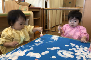 絵の具遊びでは最初に先生がタンポを使いポン!と画用紙に色をつけると「やってみたい!」と手を伸ばして興味津々な子どもたち。さっそくタンポを子ども達に配るとぎゅっとタンポを握りポン!ポン!と色をつけていきます。手に絵の具がつくと「なんだこれは?」と不思議な表情をする子ども達でしたが楽しかったようでたくさんの笑顔が見られ楽しい雰囲気で活動することができました。