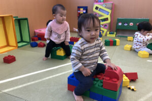 大型レゴブロックでは子どもたちと一緒にブロックを組み立ててバスやバイクなどの乗り物を作ったりお家を作ったりして楽しみました。乗り物を作るとみんなで乗り物にまたがり体を揺らして運転手さん気分♪前に乗っているお友達の横から「ばぁ~」とひょっこり出てくる姿がとっても可愛いです。