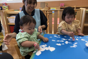 絵の具遊びでは最初に先生がタンポを使いポン!と画用紙に色をつけると「やってみたい!」と手を伸ばして興味津々な子どもたち。さっそくタンポを子ども達に配るとぎゅっとタンポを握りポン!ポン!と色をつけていきます。手に絵の具がつくと「なんだこれは?」と不思議な表情をする子ども達でしたが楽しかったようでたくさんの笑顔が見られ楽しい雰囲気で活動することができました。