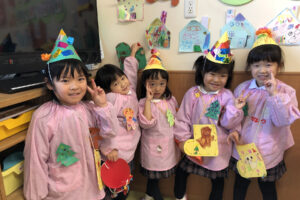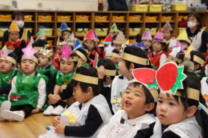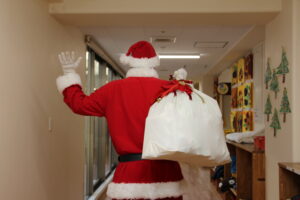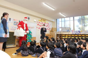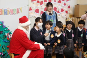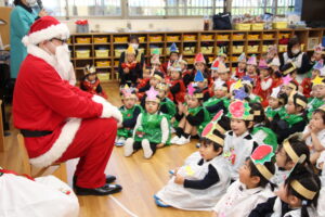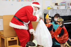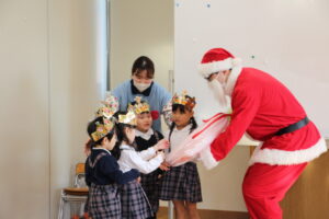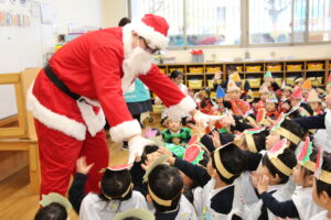 子どもたちがずっと楽しみにしていたクリスマス会!クリスマス会に向けて、ツリーや輪飾りなどでお部屋の中を飾り、年少さんは可愛らしい服も作って準備は万端です。各学年に分かれてドキドキしながら「サンタさーん!」と子どもたちが呼びかけるとシャンシャンシャン♪と鈴の音とともにサンタさんの登場です。「わぁ!本物のサンタさんだ~!」と一瞬で笑顔になる子どもたち。