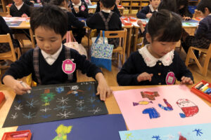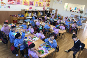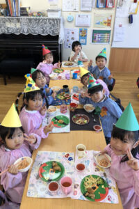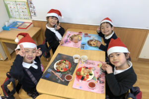 その後はランチョンマット作りをしたり、帽子や靴下の形のカバンなどを作って楽しみました。ランチョンマットにはクリスマスにちなんだサンタさんや雪、ツリーなど思いおもいに描いたり、帽子やかばんもキラキラのテープや花紙を貼ってデコレーションしていきます。作った帽子などを身に付けたり、ランチョンマットを敷いて食べるクリスマスメニューの給食に「美味しいね!」「全部だいすき。」と友だちと会話を楽しみながら給食の時間を楽しみました。大満足のクリスマス会になりました。