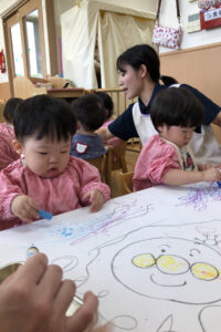 クレヨンを持ち、「じろじろ~」と模造紙にたくさんお絵描きをしました。先生が子ども達の好きなキャラクターの絵を描くと大喜びの子ども達。絵を指さしたり、上から色を塗ったりしていました!