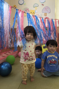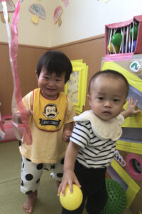 ボールあそびも大好きなひよこ組さん!お気に入りのボールを見つけ、「ぽーん」とボールを投げたり転がしたりスズランカーテンの間から顔を出し「ばあ!」と何度もかわいいお顔を見せてくれました♪