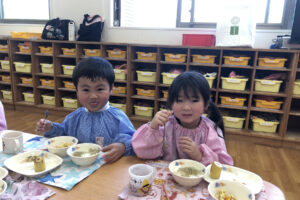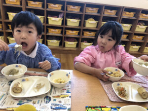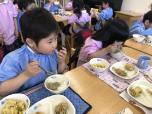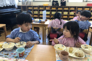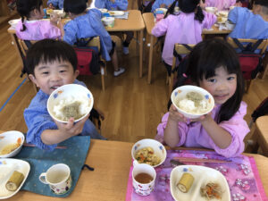 今月は「とろろこんぶ」です。ご飯の上にのせると美味しそうに頬張る年中さん!