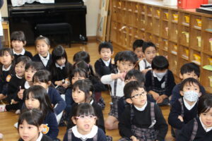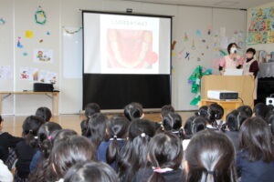虫歯にならないために砂糖がたくさん入っているお菓子やジュースを食べ過ぎないこと、食べるときは時間を決める事などを勉強しました。真剣な顔でお話を聞く年長さんです。
