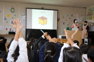 虫歯になったらどうなるか、虫歯の元のむしばいきんとはどんなものか、実際の写真や映像を見て虫歯の怖さを知る年長さん。