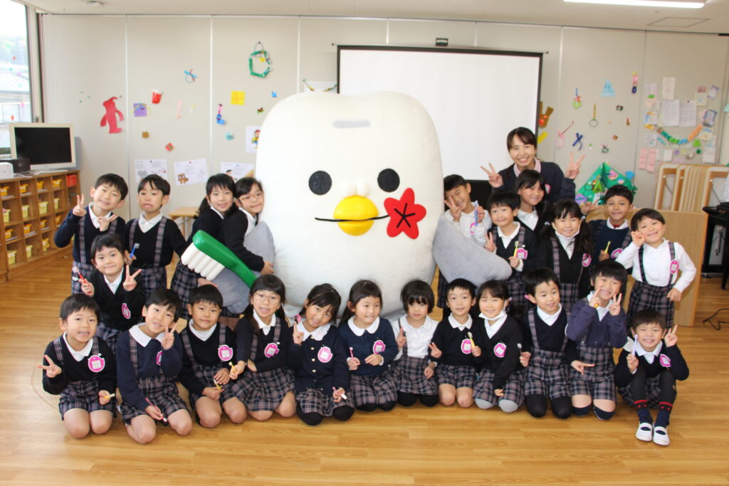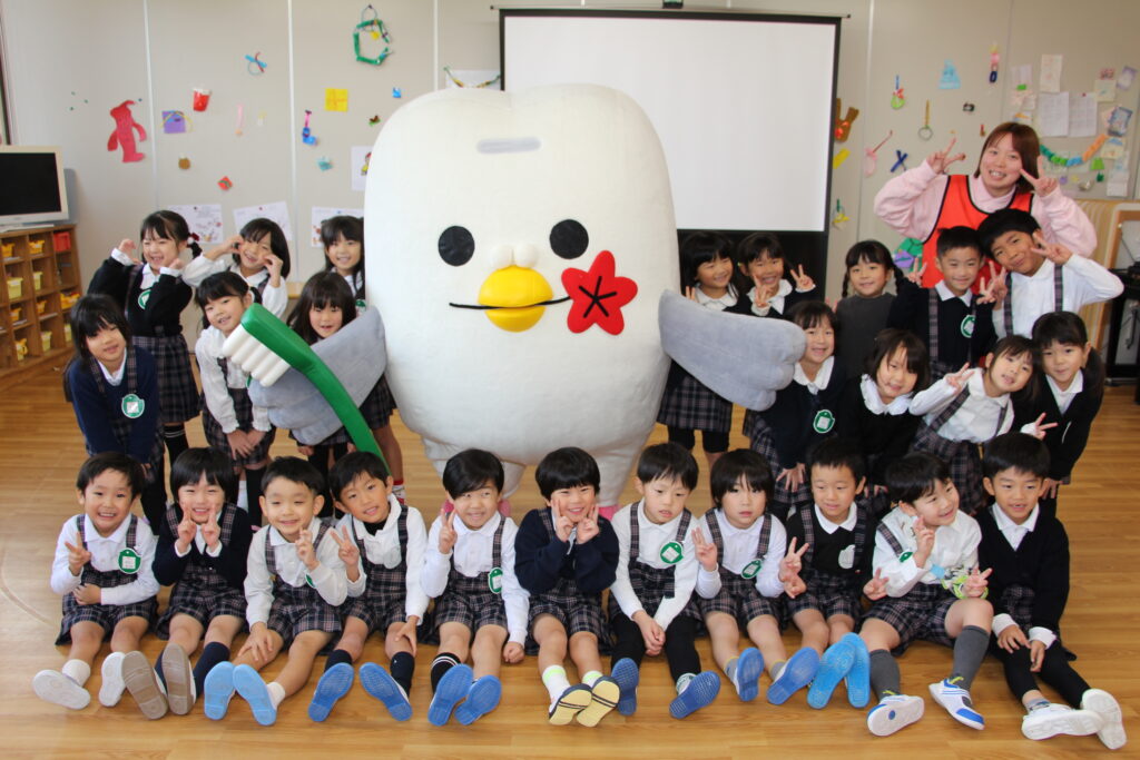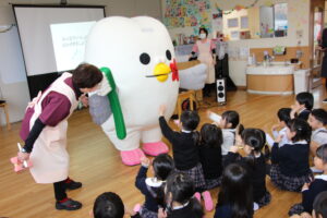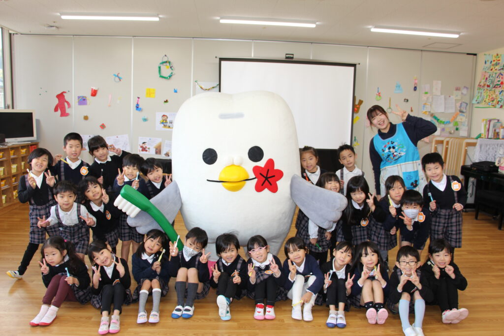 はっぽくんも登場し、正しい歯の磨き方を教えてもらい、楽しい雰囲気の中、音楽に合わせてみんなで歯をみがく練習をしました。