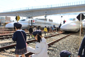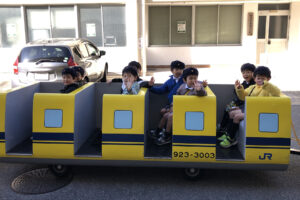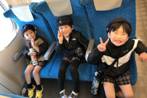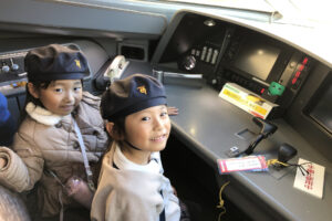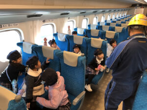 みんなで新幹線ののぞみに乗せてもらい、二人ずつ運転席に座って「次は〇〇です。」とアナウンスもしてみたり、座席では職員さんにいろんな質問をして楽しく過ごしました。