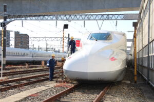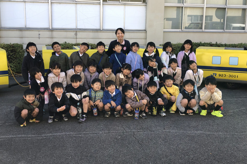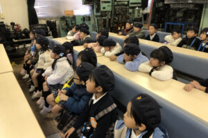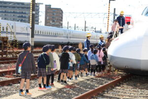 これまでにどんな新幹線があるのか図鑑などで調べたりしながらとても楽しみにしていた年長さん!元気よく挨拶をし、3クラスに分かれていろんなところを見学しました。