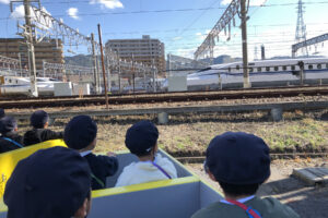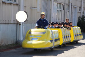 子どもたちに大人気のミニドクターイエローの乗り物に乗って、施設内を走りながら「操縦機」などの普段見れないものをみたり、作業中の職員さんに「頑張ってくださーい」と声をかけたりと大興奮の子ども達。新幹線がとまっている場所に着くと、「ここは新幹線のお家ですか?」という質問に「ここは新幹線を掃除したり、点検したり故障したところを直したりするから、お家というより病院に近いです。」と教えてもらいました。ちょうどレールスターのワンピース号を見ることが出来て大喜びでした。
