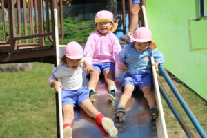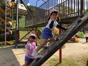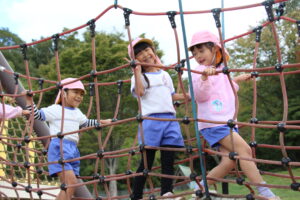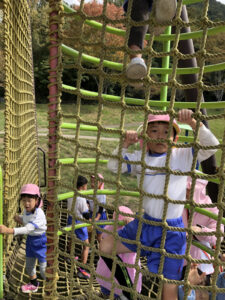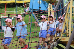 バスに乗って海田総合公園に着くと、大きなハチのシンボルが見える滑り台を目指して歩きました。ローラーの長い滑り台や吊り橋を渡ったり網のネットを登ったりといろいろな遊具に大喜び。友達を誘い合って楽しみました。