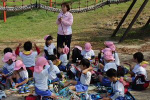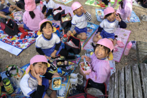遊んだ後は待ちに待ったお弁当タイムです。「みてみて、〇〇が入ってる!」「唐揚げが一緒だね!」と友達と見せ合いながら口いっぱいに頬張ります。外でみんなで食べるとより一層美味しく感じたようです。