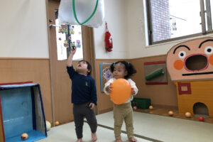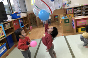 風船あそびをしました。ビニール袋で作った風船を「えい!」と言いながら叩く子どもたち。跳ね返ってきた風船も上手にもう一度叩きます。