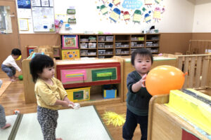 カラー風船は結び目を持ってぶんぶん!お顔に当たっても気にせず楽しむりすぐみさんです。天井に向かって“ぽーい”と投げた風船も、タイミングよく跳ね返して空中をふんわふんわ浮かせています。