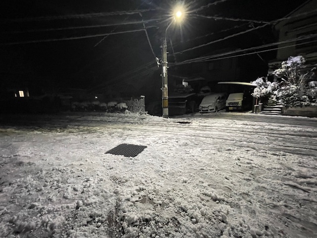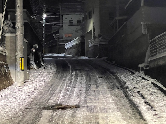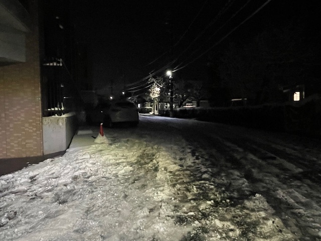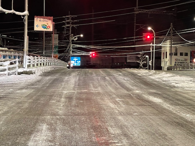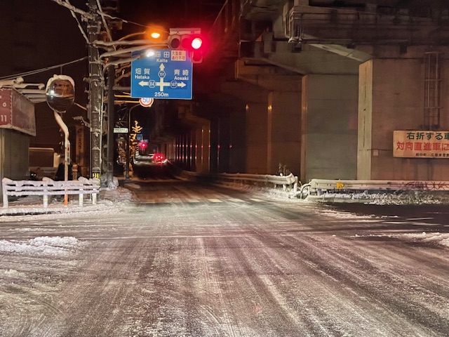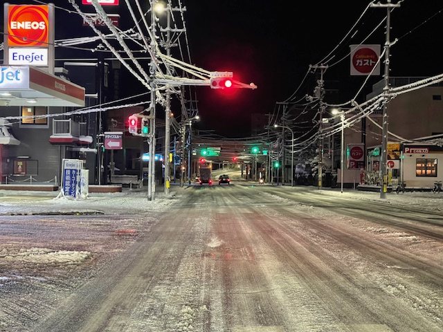 路面は全面凍結しています。通常の発進、停止でも滑るところが多いです。