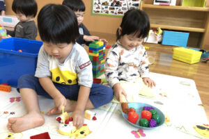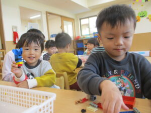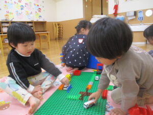 お部屋では、ブロックや積み木で集中して遊ぶことを楽しんでいます。