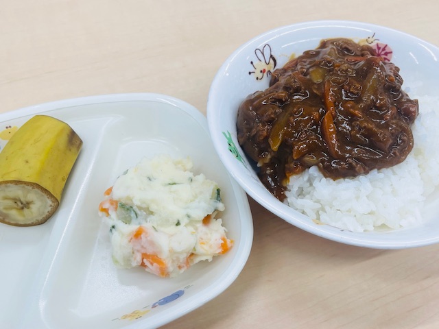 今日(12/20)の給食です - ハヤシライス ポテトサラダ バナナ